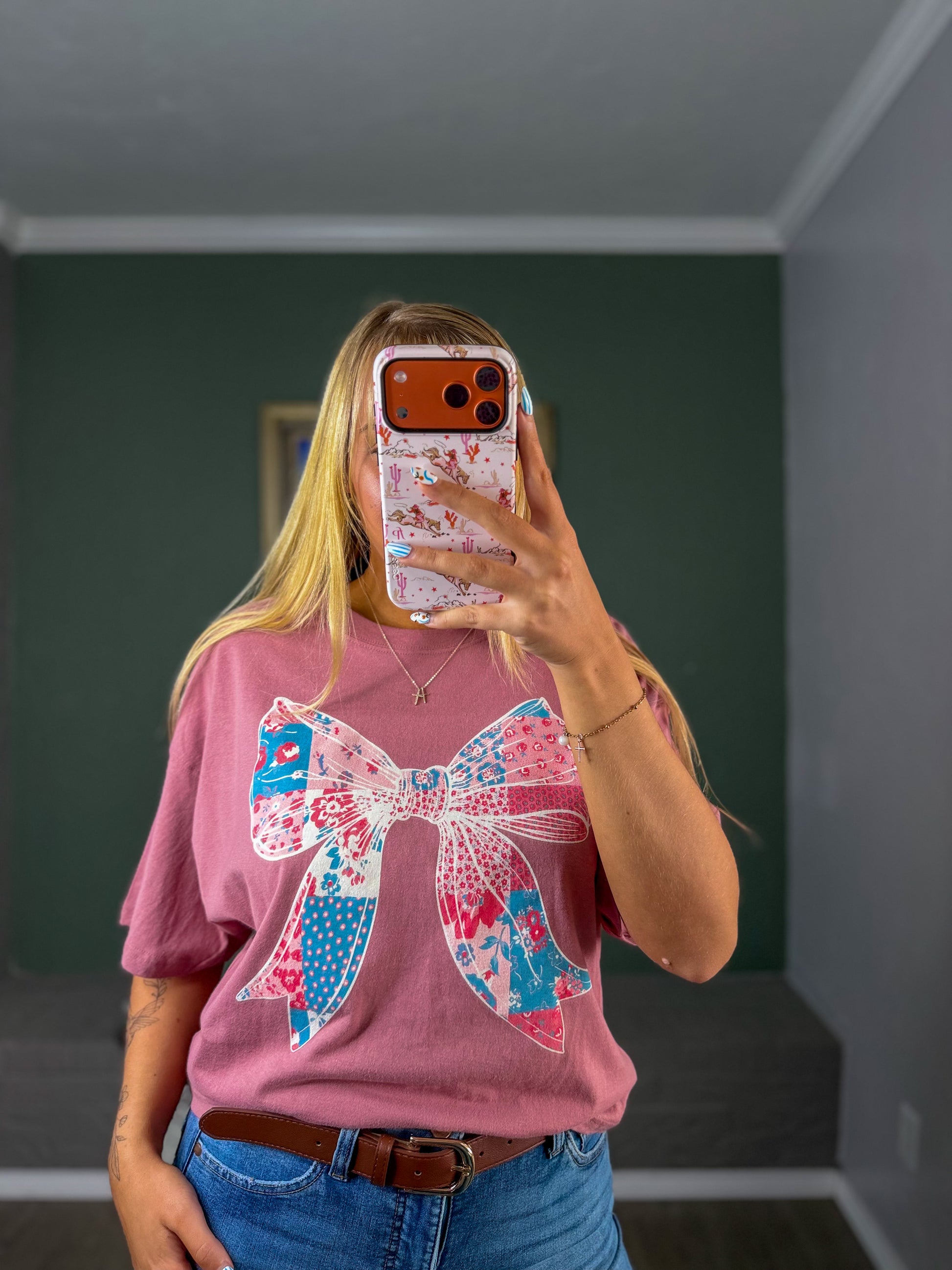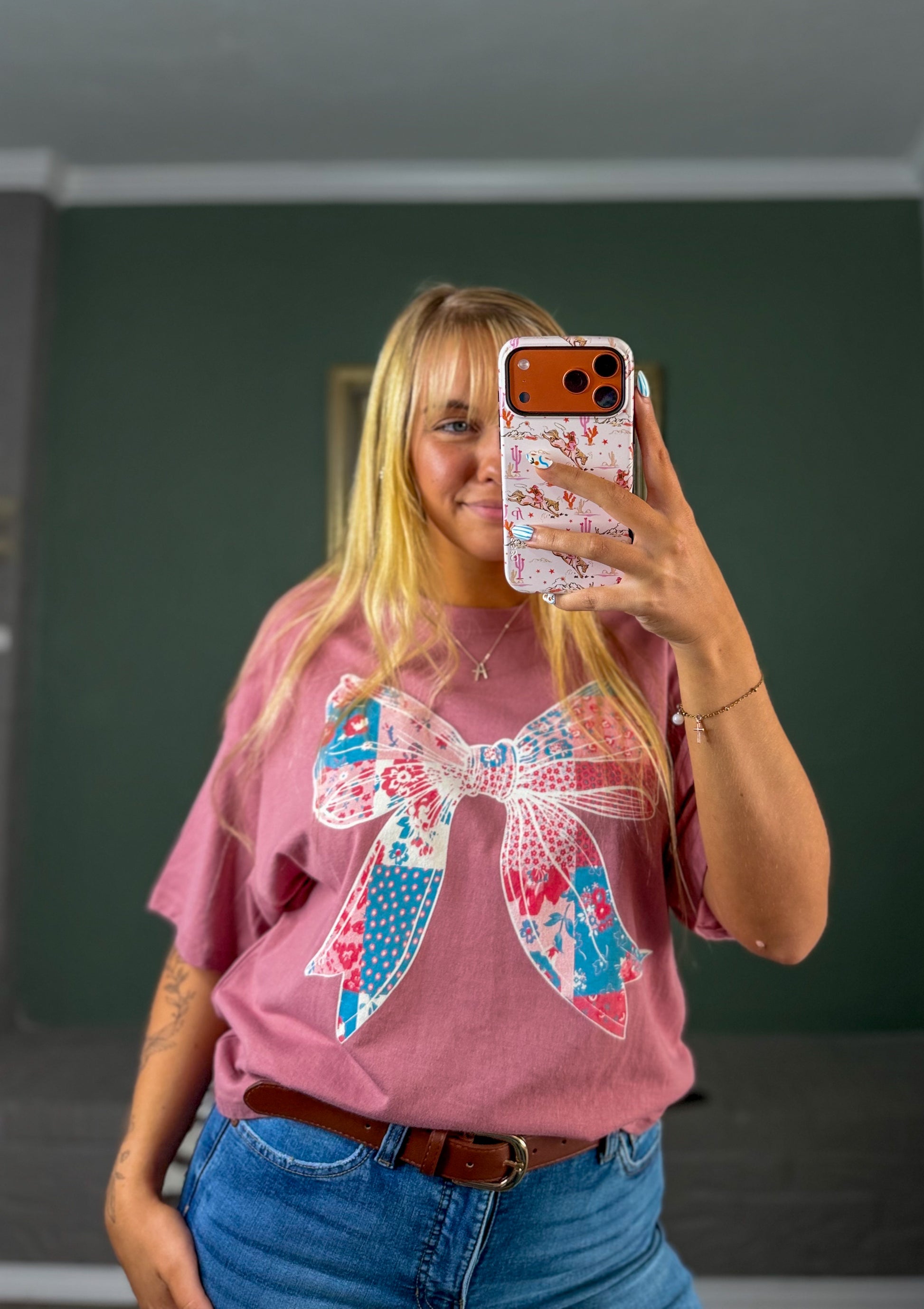 The Quilted Bow Crop Top is where city-girl cool meets artsy charm. Featuring a bold quilted bow and patchwork flower graphic, this slightly cropped tee brings texture and personality to any outfit — dressed up with wide-leg trousers or kept casual with your favorite denim.
